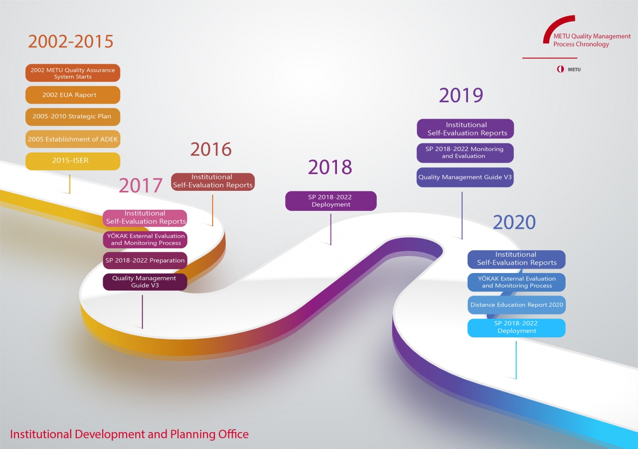 The Strategic Plan for 2011-2016 was prepared after the Quality Commission and a broad participation study process. Within the scope of the Strategic Planning culture, it is aimed for METU to employ academically high-quality faculty members and to maintain the internal quality stemming from the professional and academic pride of the faculty members. In this framework, accreditations were obtained at the level of faculty, department and administrative unit, and studies for quality monitoring became systematic. In addition, METU, which passed the YÖKAK External Evaluation Process in 2017, passed another quality audit conducted for the monitoring of the evaluation in December 2020. The aforementioned processes are based on the Internal Evaluation Reports of the Institution, which have been prepared annually since 2015.